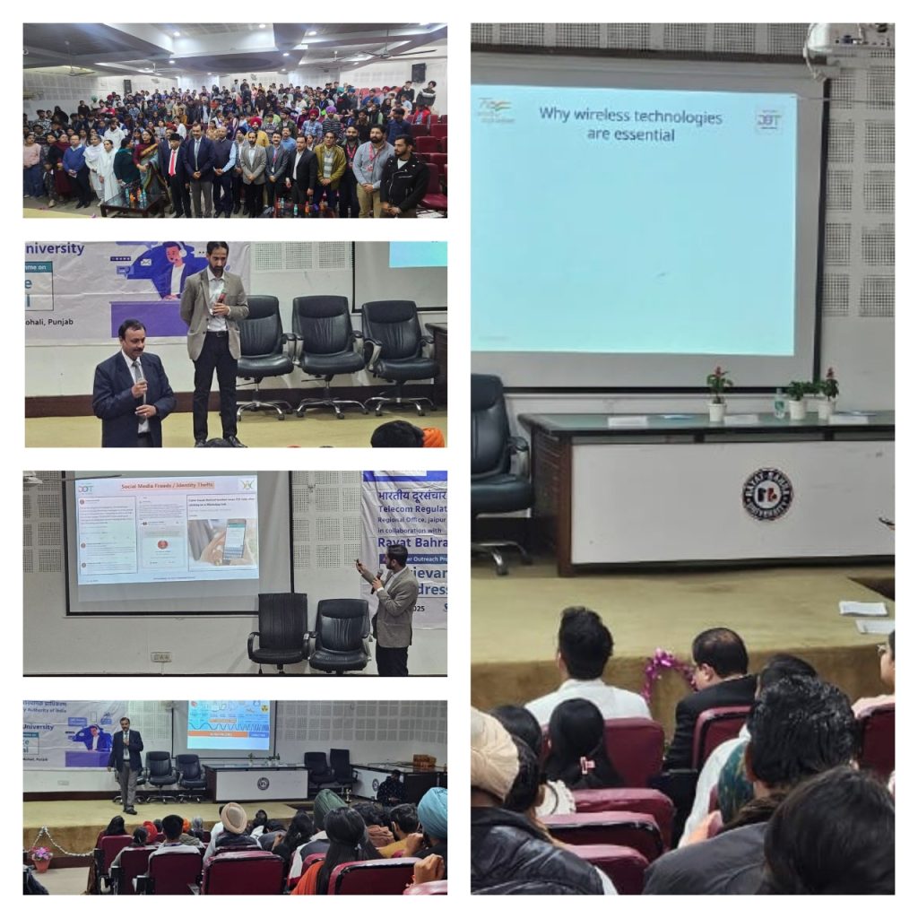 Punjab LSA & TRAI held a Consumer Outreach Program at Rayat Bahra Univ on 11/12/25. Directors Rajeev & Chetan Sharma led sessions on EMR, Sanchar Saathi & Cyber Hygiene. 200+ students, faculty, TSPs & consumer reps joined; pamphlets distributed for awareness.